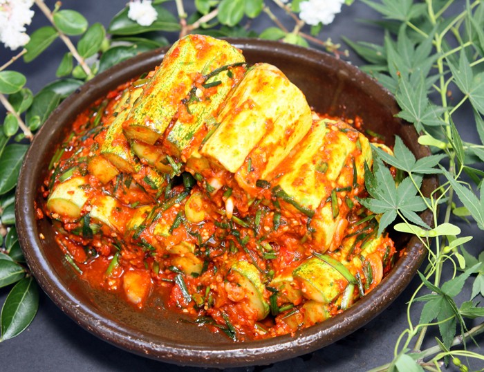 오이에 십자로 칼집을 넣어 양념한 소를 넣고 익힌 소담채 오이 소박이는 봄, 여름에 주로 먹는 별미김치입니다.